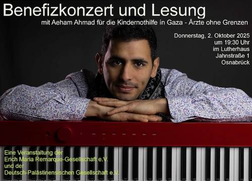Mit diesem Benefizkonzert wollen die Erich Maria Remarque-Gesellschaft e.V. und die Deutsch-Palästinensische Gesellschaft e.V. Spenden für die notleidenden Kinder in Gaza sammeln.